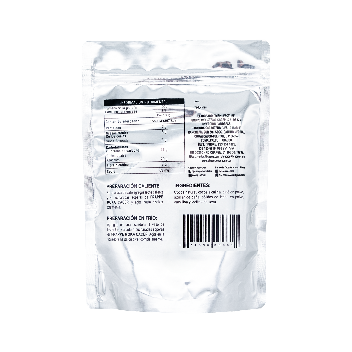 Ingredientes: Cocoa natural, cocoa alcalina, café en polvo, azúcar de caña, solidos de leche en polvo, vainillina y lecita de soya.