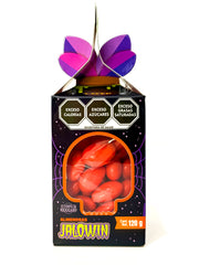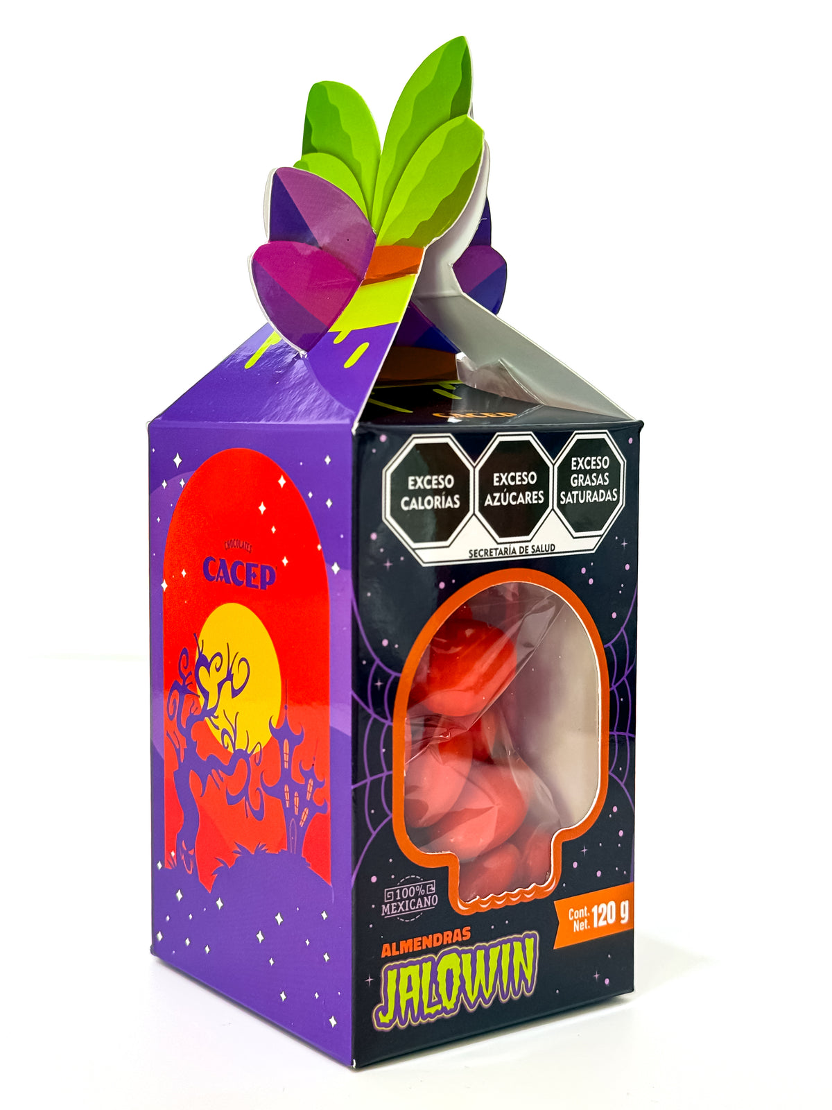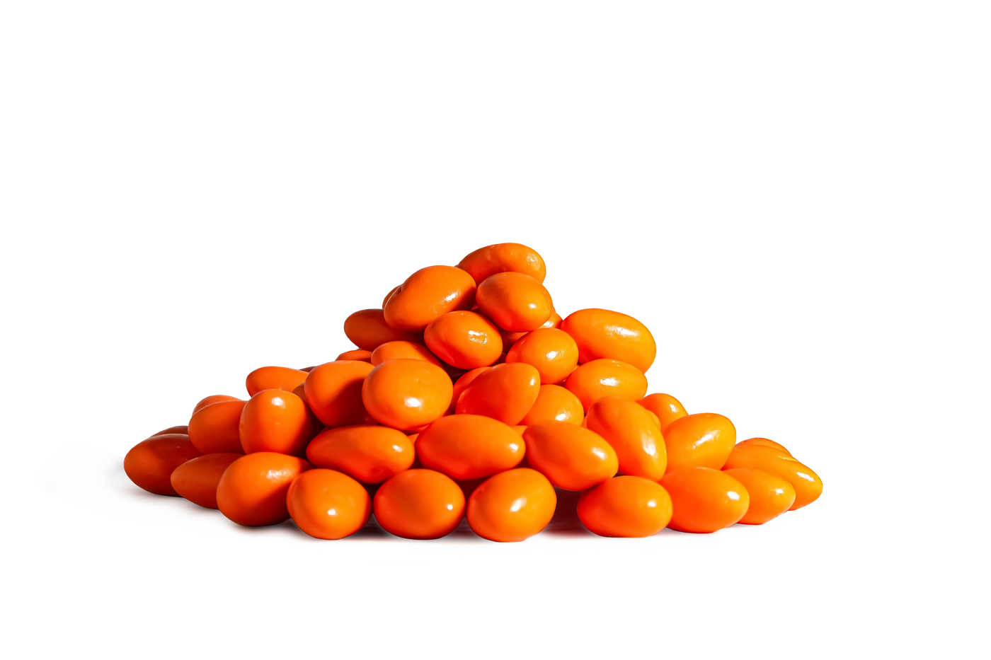 Confitura de almendra, cubierta de chocolate blanco color anaranjado, con toques de sabor a naranja (sabor parecido a froot loops).