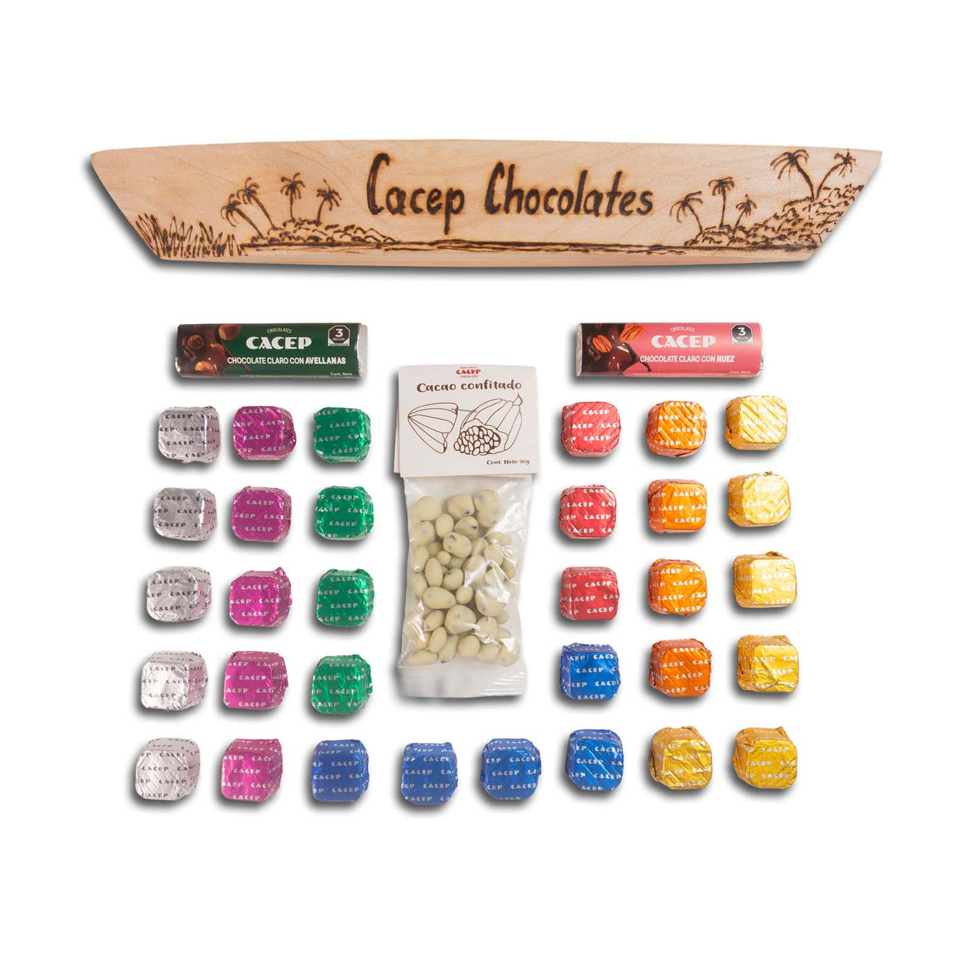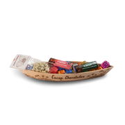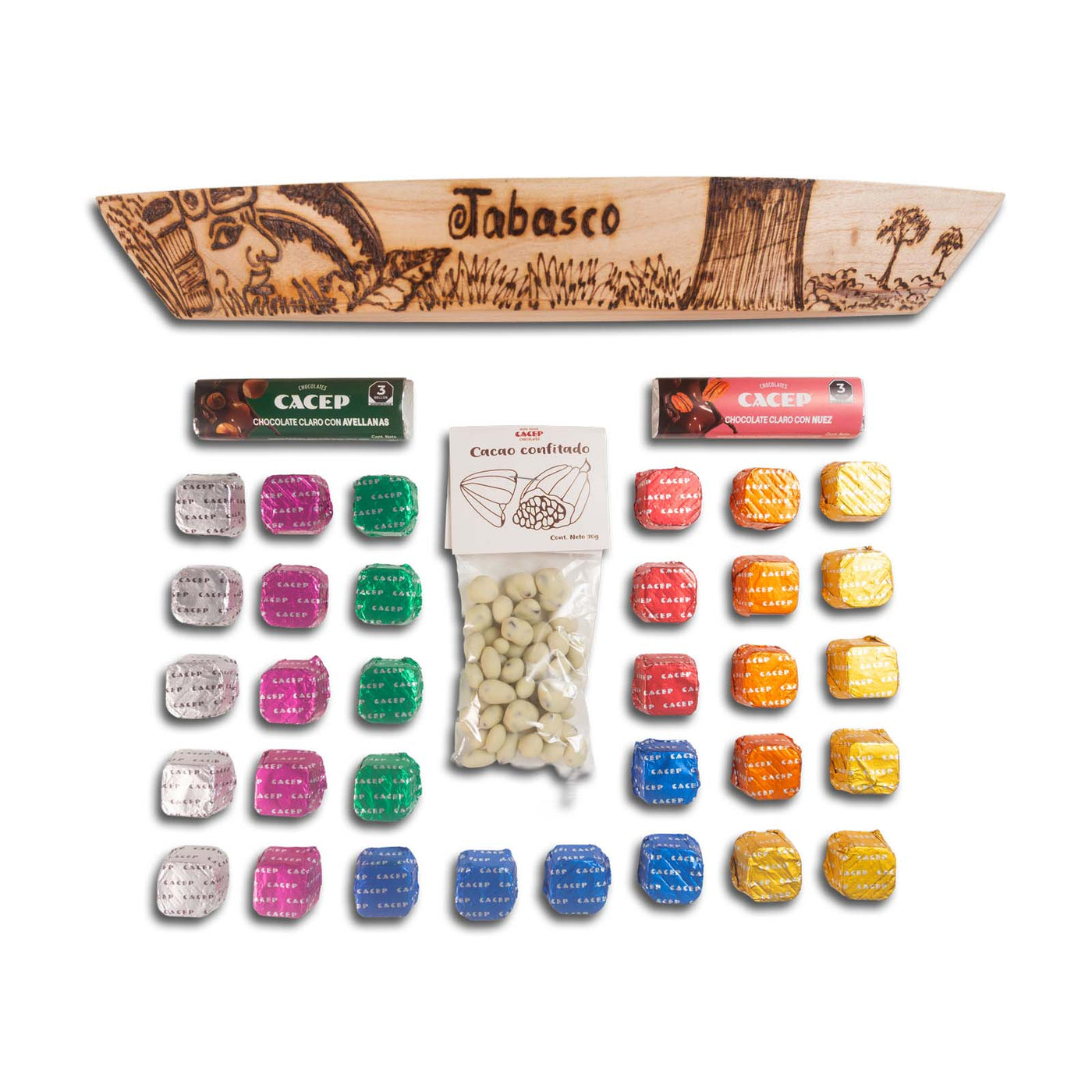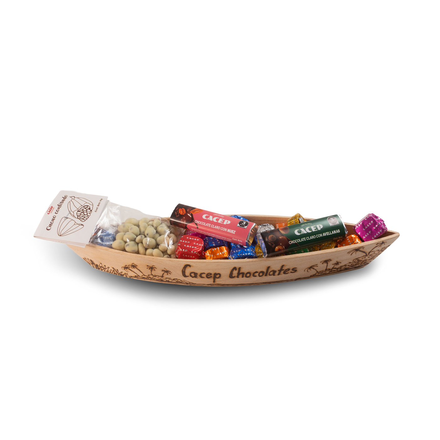 Tallado y grabado a mano, por artesanos tabasqueños, el cayuco de madera trae dentro cremosos chocolates con distintas semillas. Es ideal para regalar o para consentirte.