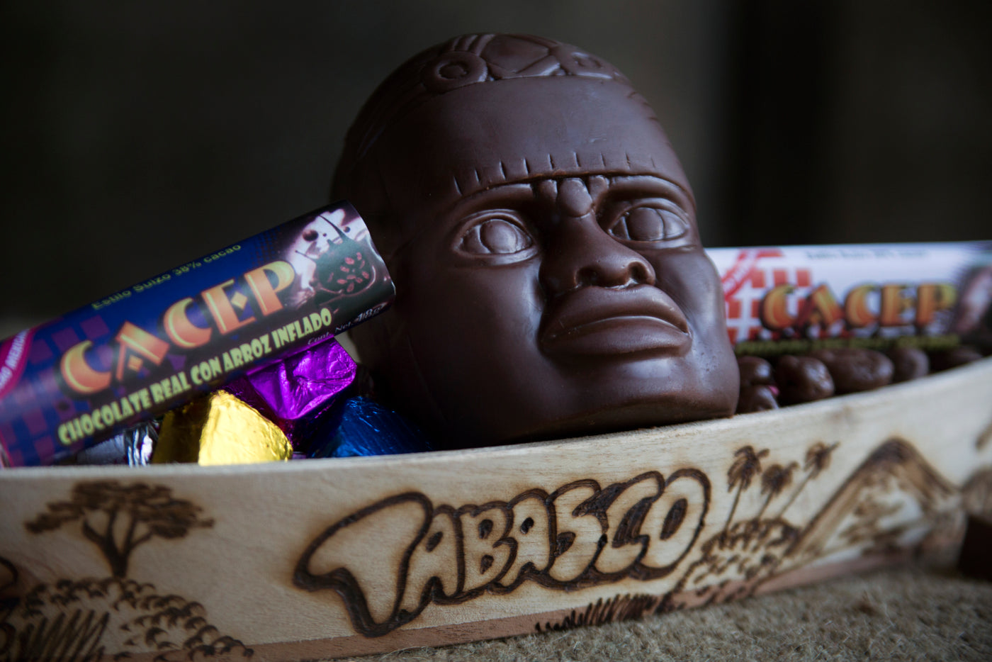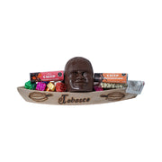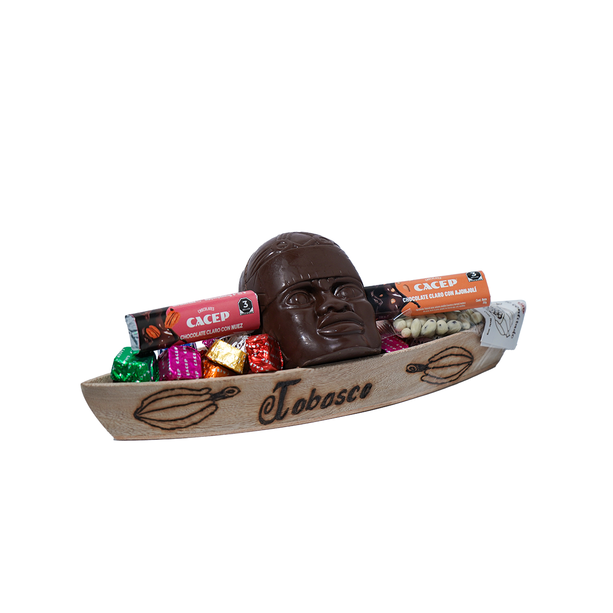 Tallado y grabado a mano, por artesanos tabasqueños, el cayuco de madera trae dentro cremosos chocolates con distintas semillas. Es ideal para regalar o para consentirte.