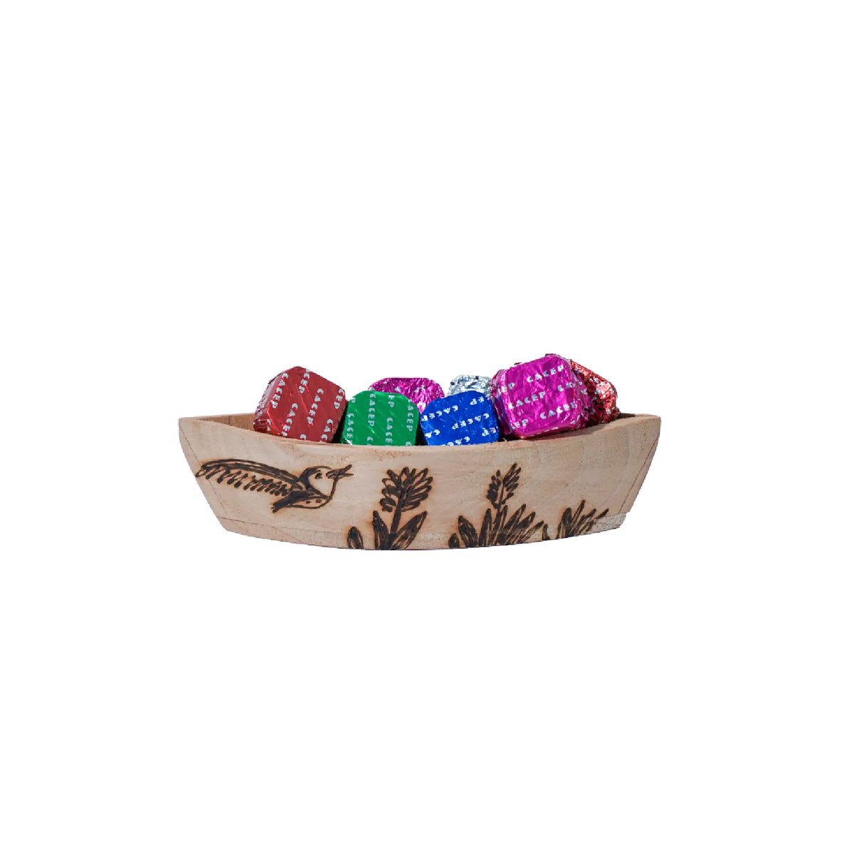 Cayuco de madera pirograbado, micro – CACEP Chocolates